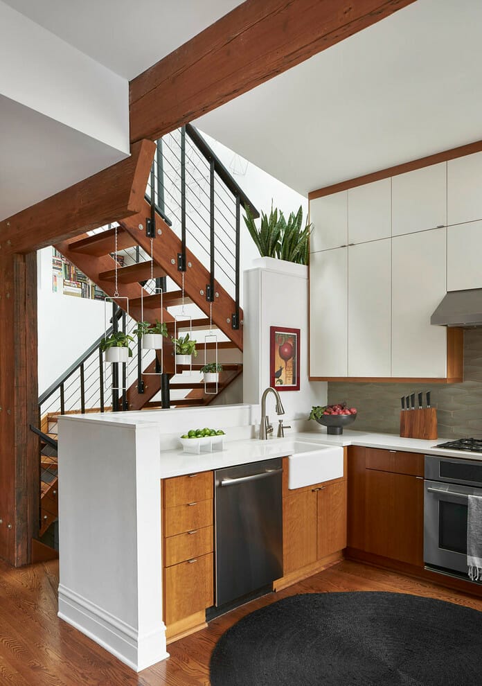 For a slight contrast, the pony wall is in broken white. Meanwhile, the pop of colors is served by the fruits displayed on the countertop.
