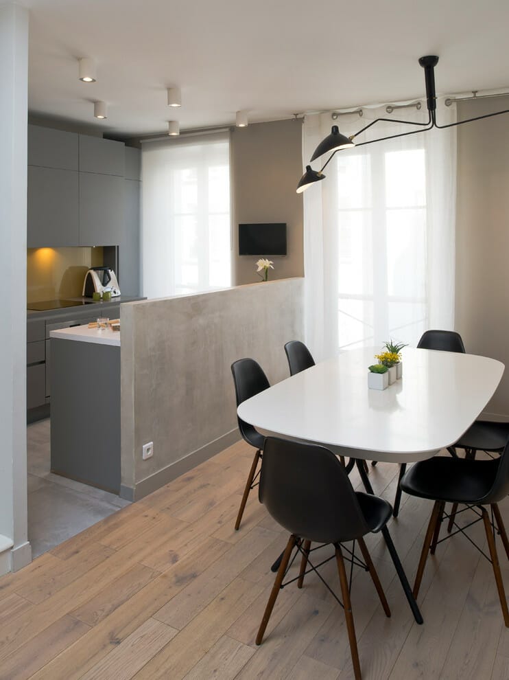 This plaster-finished pony wall matches the grey cabinetry in the kitchen area. Its neutral color also sets a nice background for the black and white dining space.