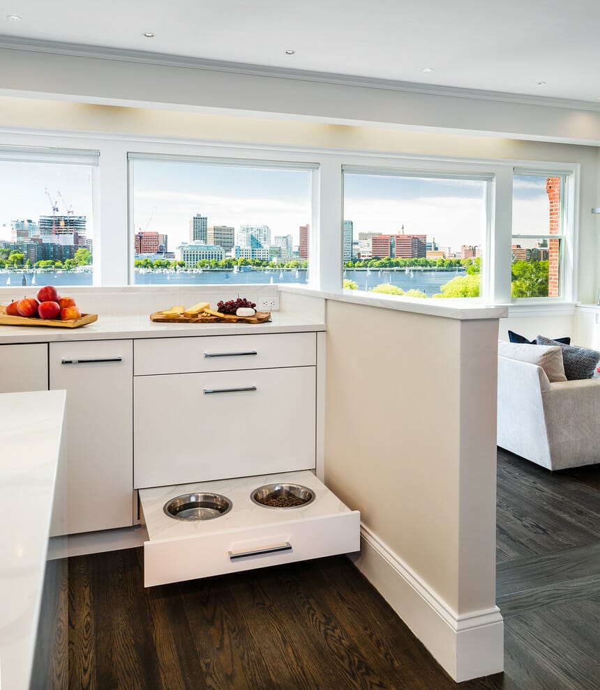 Instead of kitchen tools only, the cabinetry also houses pet dishes that allow you to keep them concealed when no use.