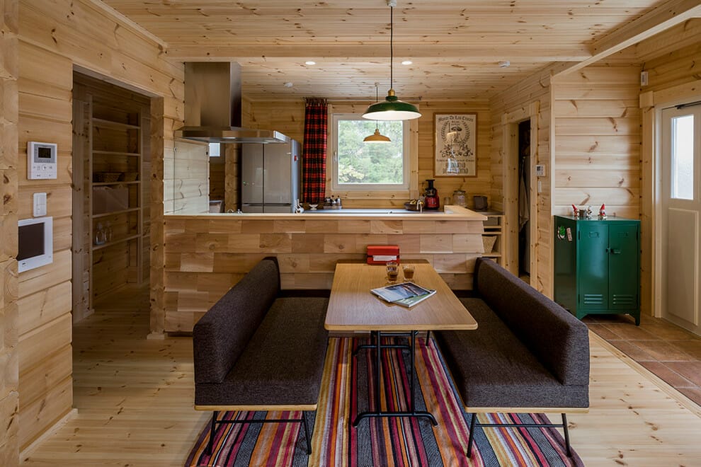 While most of the surfaces are made of wood, the kitchen and dining area appear so welcoming and cozy.