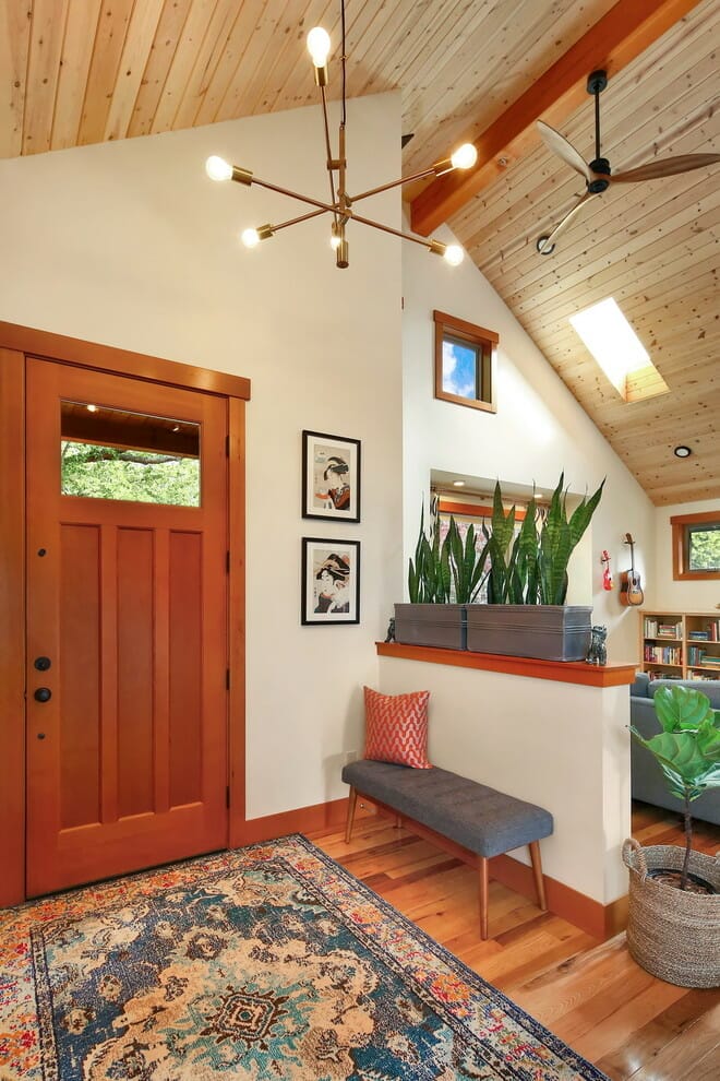 A pony wall completes this gorgeous entryway. It separates the entrance area from the living space while directing foot traffic towards the home.