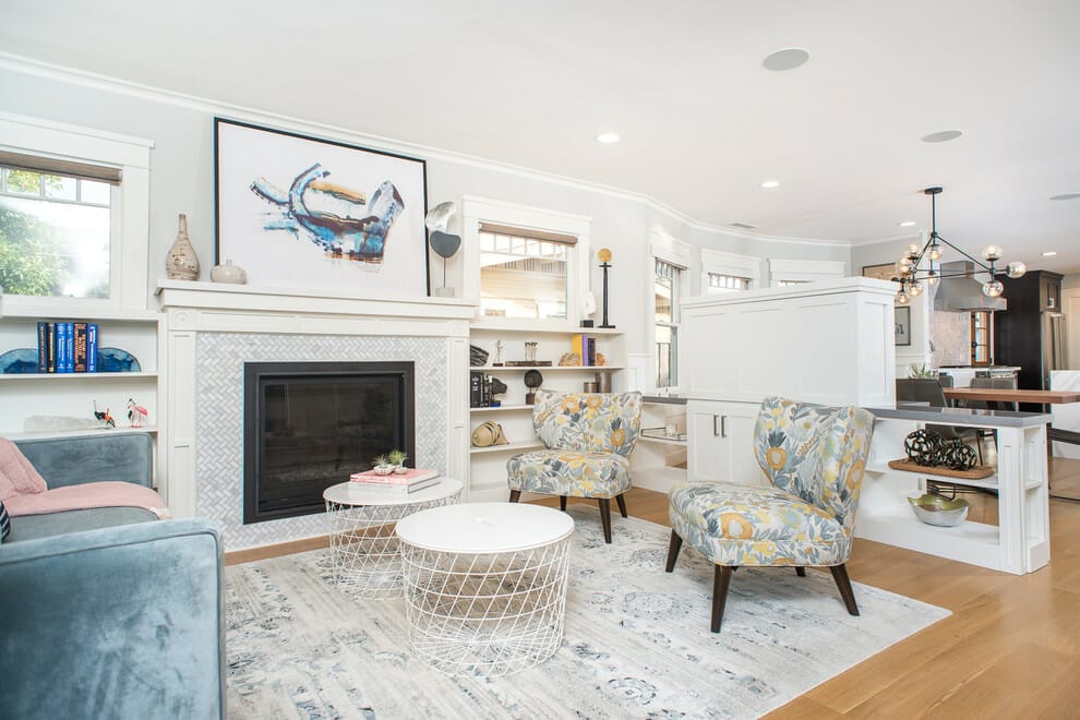 This pony wall separates the dining area from the living room. Then, the wooden top mirrors the wall-mounted shelves above the fireplace and the parts of the furniture.