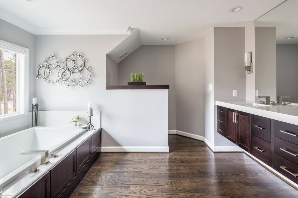 With a floating wall-to-wall sink and a luxurious bathtub, this master bathroom serves as a comfortable retreat after a long, busy day.
