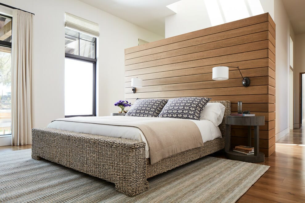 This wooden pony wall doubles as a headboard and an accent in this stunning bedroom. It houses a pair of mounted lamps that allow the nightstand to keep other decorations or stuff.