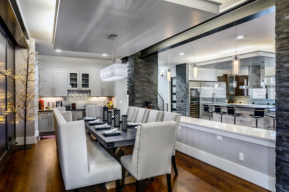 A combination of natural stone vibes and a sleek modern style makes this pony wall a perfect addition to this dining room.