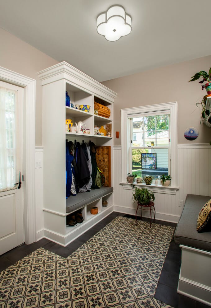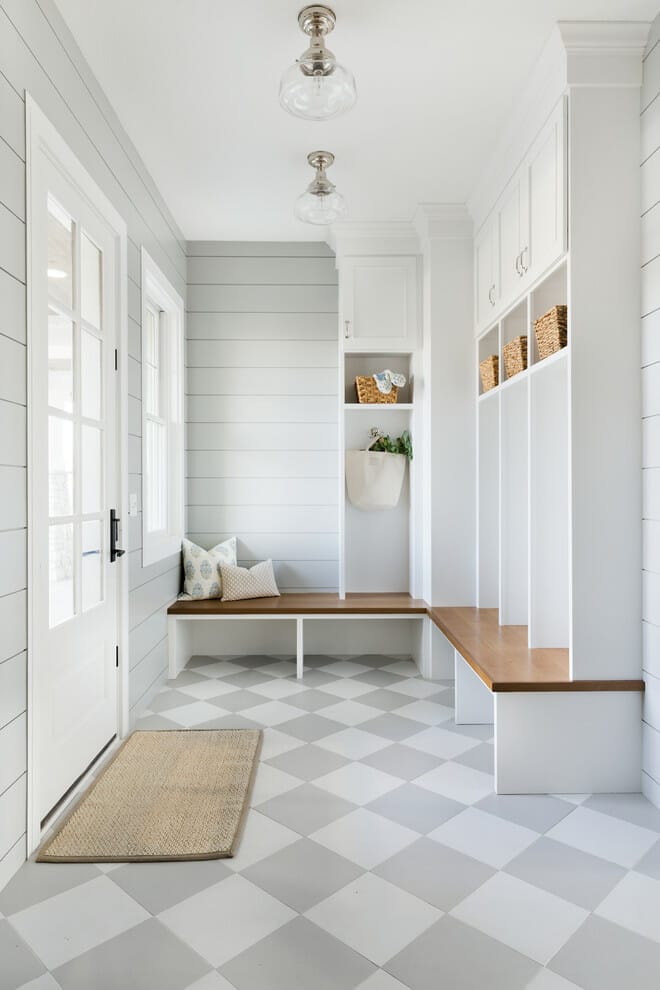 In the picture, you see a sweet disagreement between the harlequin floor and the shiplap walls. Accentuated by medium light tone wood on the woven mat, benchtop, wicker baskets, and lighting fixtures, the entryway even looks more gorgeous.