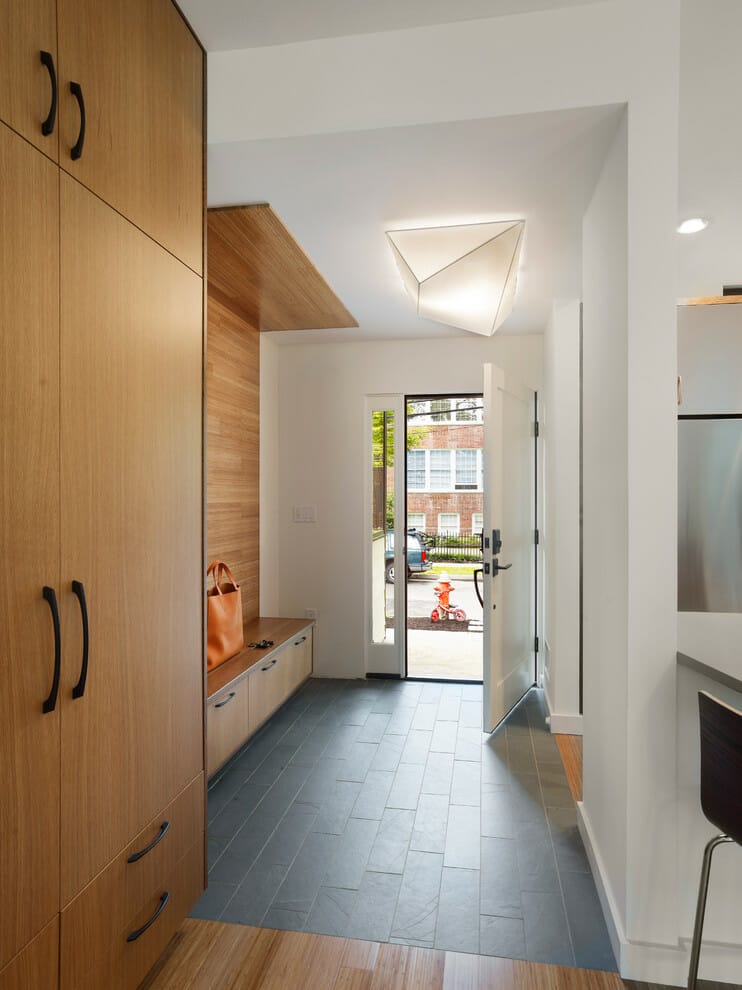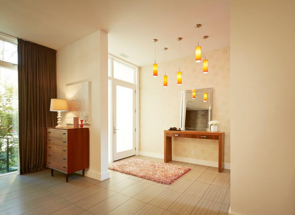 Well, tiled entryway ideas executed here involve matte gray tiles derivable from either slate or concrete. Then, they are settable vertically for a more elongated space impression.