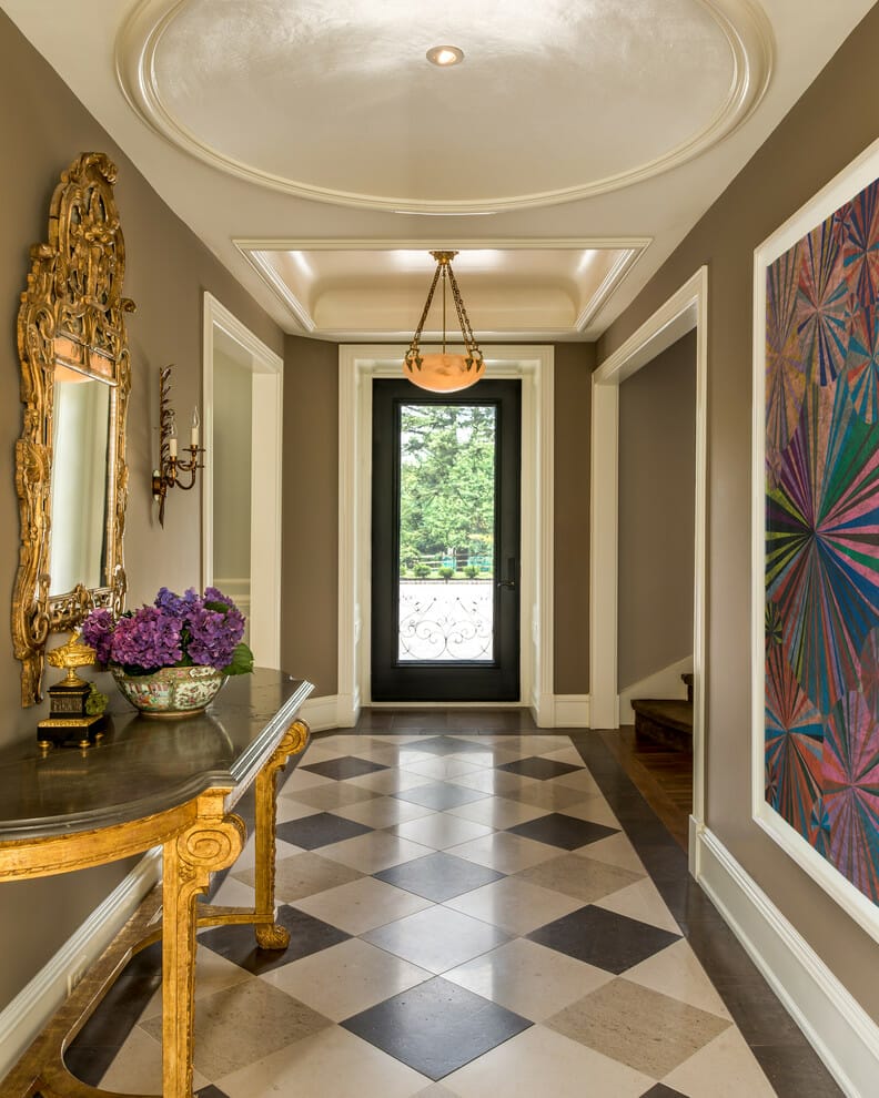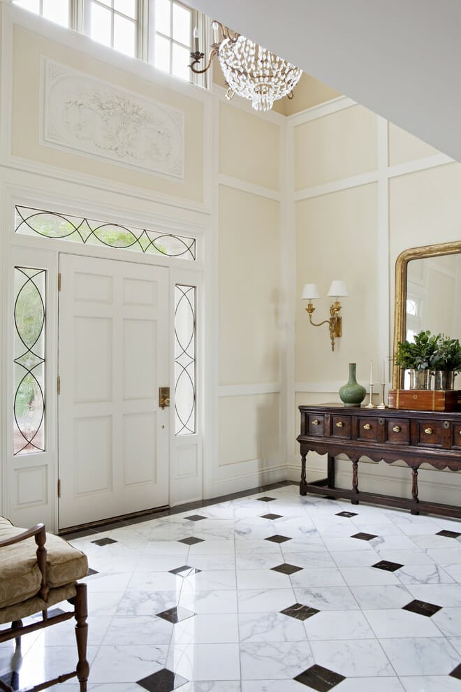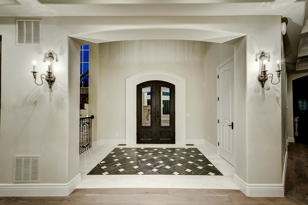 By turns, black and white marble tiles are installable to finish this entranceway floor, adding one more insight to the long list of checkered tiled entryway ideas.