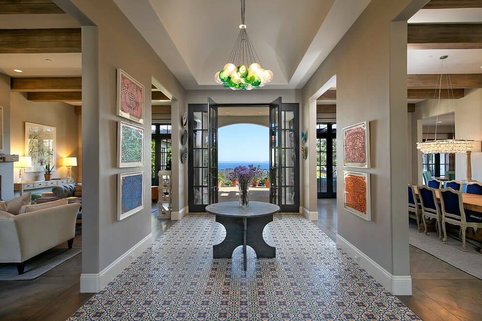 Multicolor tiled entryway ideas always result in wow, and it also applies to this Mediterranean entranceway. Blue patterns mark the entrance, as it is distinguishable from the rooms’ flooring on both sides. Then, five colored wall arts complement to complete the hospitable set.