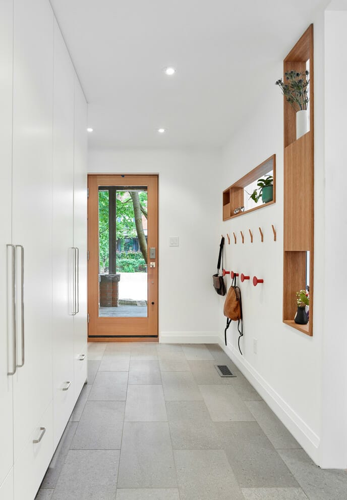 Then, wall hooks and knobs are settable on the front wall to prevent everybody from throwing their traveling apparel and hang them tidily instead. Ceiling-height storages on the other side then complete the self-declutter methods.