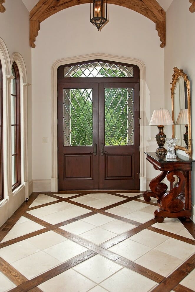 Dark tone wood and beige tiles floor seen here make a combination for traditional tiled entryway ideas.