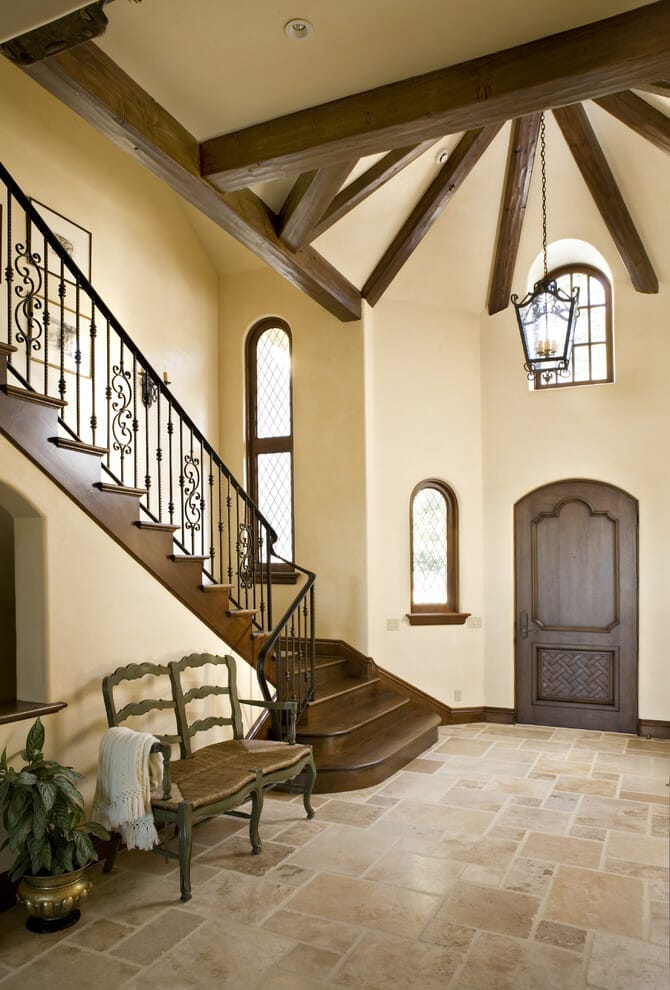 An arched door lends any house a royal feel, and this humble foyer has such a sense given by the wooden main portal. Let alone, the glass sidelight over the staircase increases it.