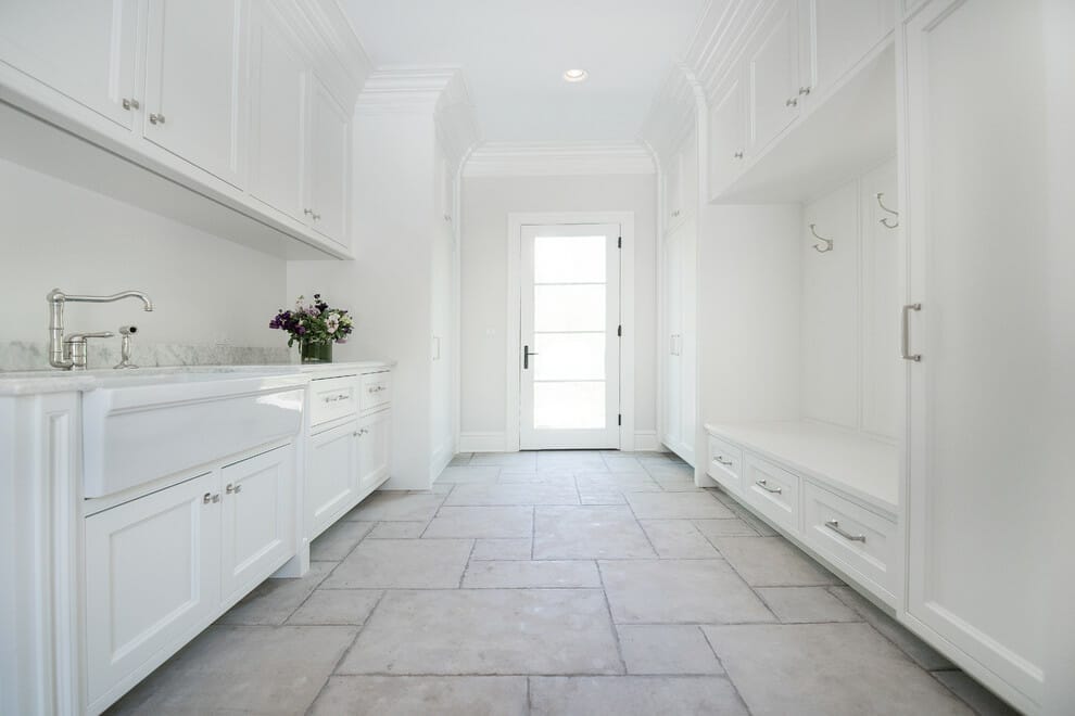 Specifically, gray tiles are installable vertically to be the base of the white interior. Such flooring is obtainable through limestone, porphyry, rose granite, Trieste marble, or slate slabs.