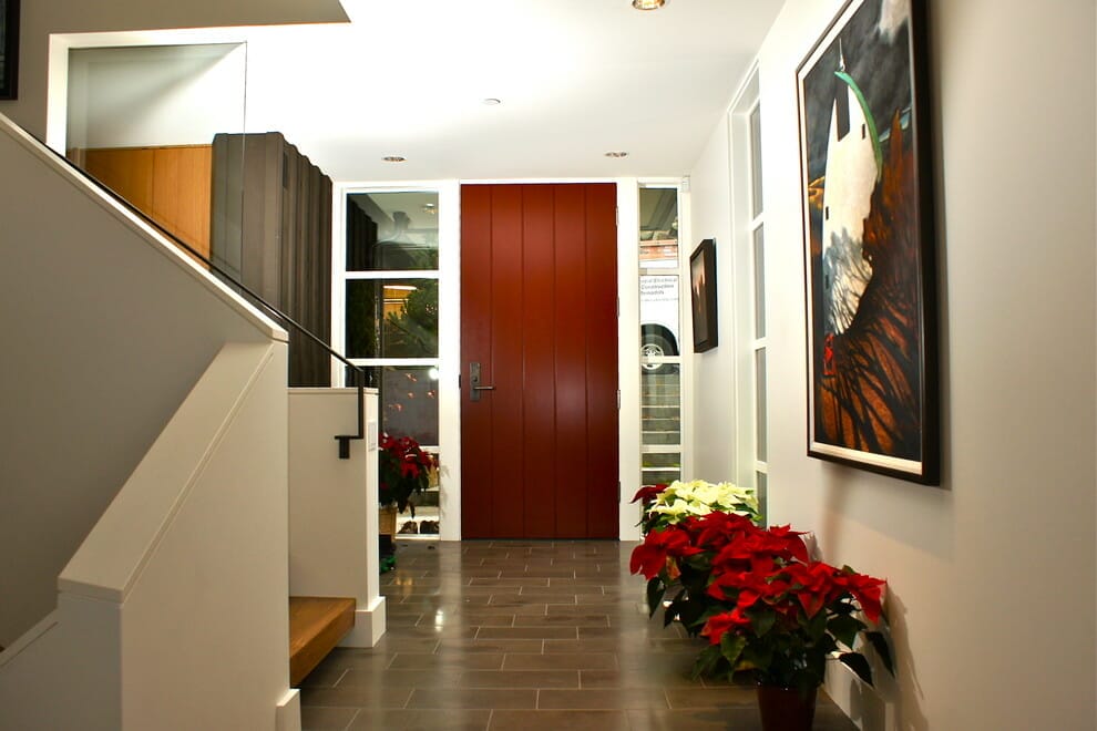 However, here, the impression is not only about the flooring but also the whole contemporary design, including the red front door, paneled sidelights, red and white houseplants, wooden staircase, and even the artworks.