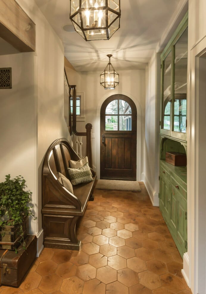 These terracotta tiles show some natural cracks to sign the old fashion style. But, no one could resist their eclectic charm in an entryway.