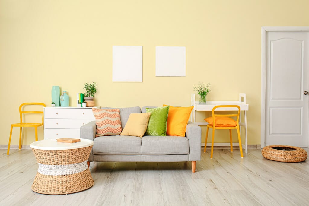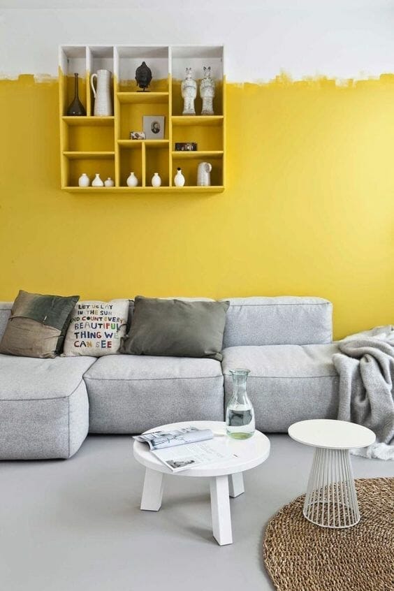 For instance, this living room occupies insipid yellow as the background to highpoint the single cool grey sofa and fresh white furniture. Yet, it still feels dominant.