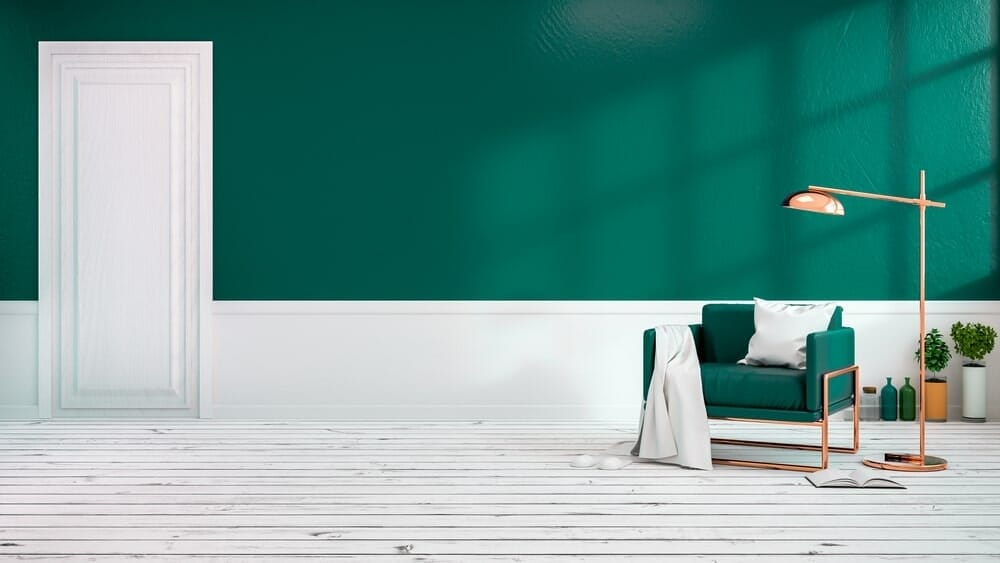 This living room makes the list of teal blue wall coloring ideas longer by installing white molding at two-fifths wall height.