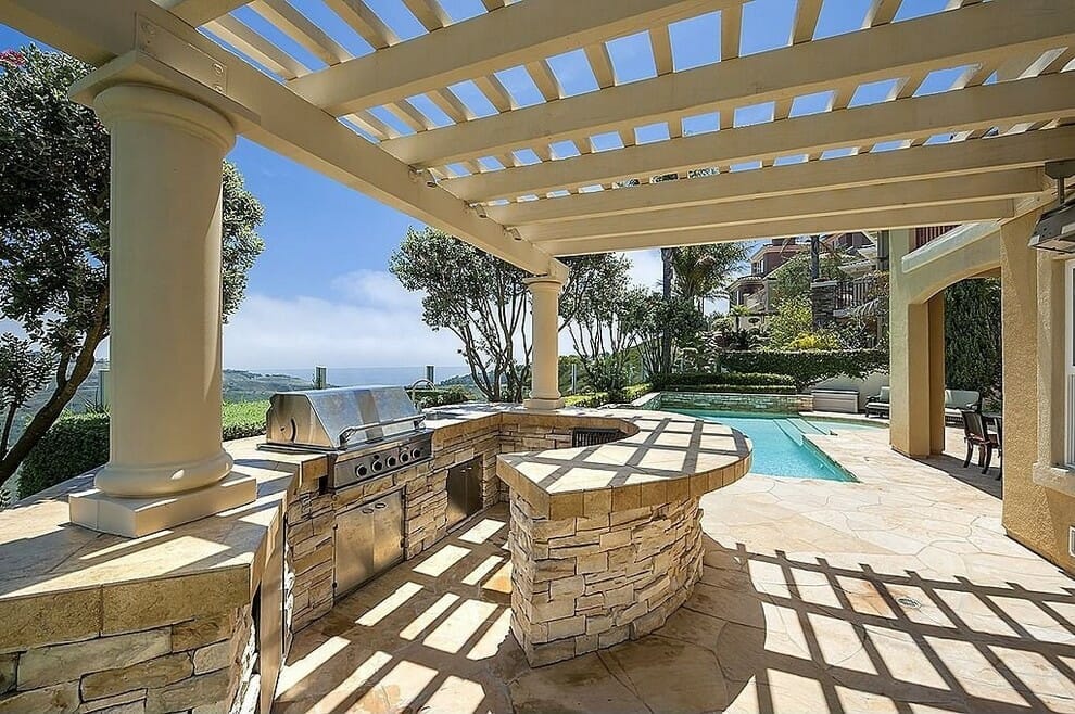 This kind of patio cover is much loved because it can give an exciting personality, especially when the sun is shining. The shadows reflected on the floor below make your outdoor BBQ island more aesthetic.