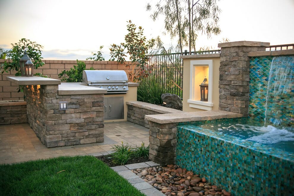 There are many ways to elevate the view of your outdoor kitchen. Some of them are by modifying BBQ island ideas with several ornamental objects such as a mini waterfall and a built-in lantern.