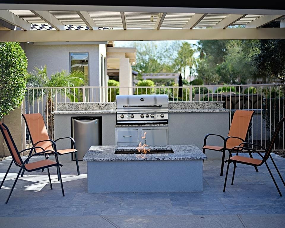 Arranging a gathering spot alongside a grilling area is a clever application of BBQ island ideas. Especially if you also provide a fire pit in the center of the space. It will make your evening gathering warmer.