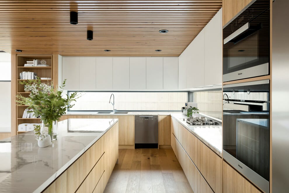 Talking about trendy ceiling ideas for kitchens, blonde wood planks are your friends. Here, they lend the soaring ceiling a welcoming look.