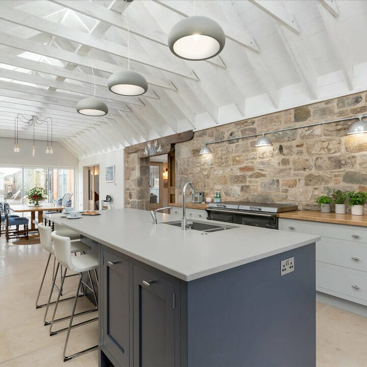 The white vaulted ceiling with visible beams leads the eye to stone and gray walls. Also, it anchors cooking and eating areas while amplifying the airy nuance.