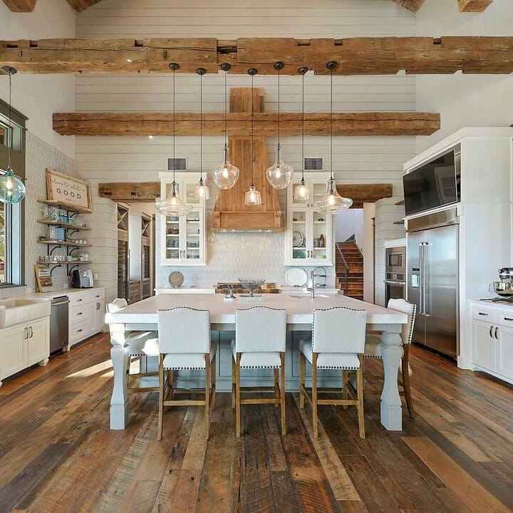 This all-white kitchen seems equal parts stylish, rustic, and bright. Moreover, the stark white beams accentuate the vaulted ceiling. They coordinate marvelously with Scandinavian-style pendants and sleek bulbs, too.