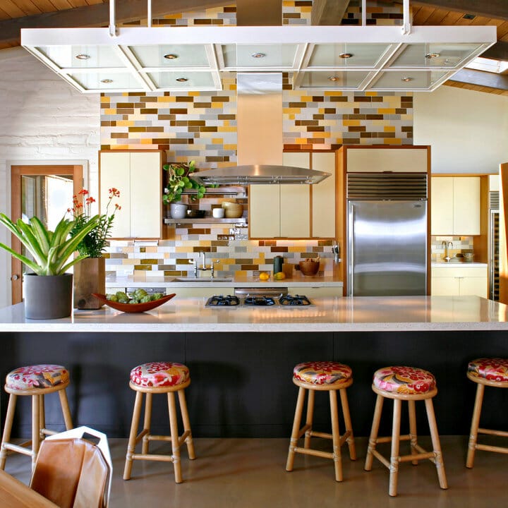 Here, the suspended wooden ceiling panel adds warmth. Meanwhile, cluster pendant lights make the tray ceiling look softer. Also, the patterned backsplash attracts the eye.