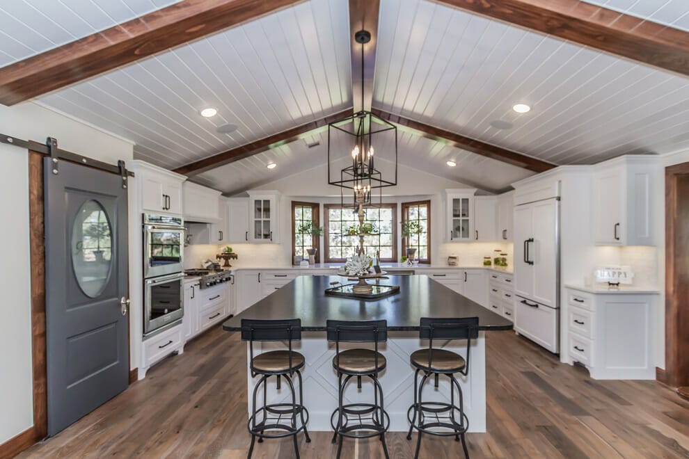 In this kitchen, the white shiplap ceiling tempers the black island, stools, and cube pendants. Also, it quickly intensifies the airy ambiance the windows carve.