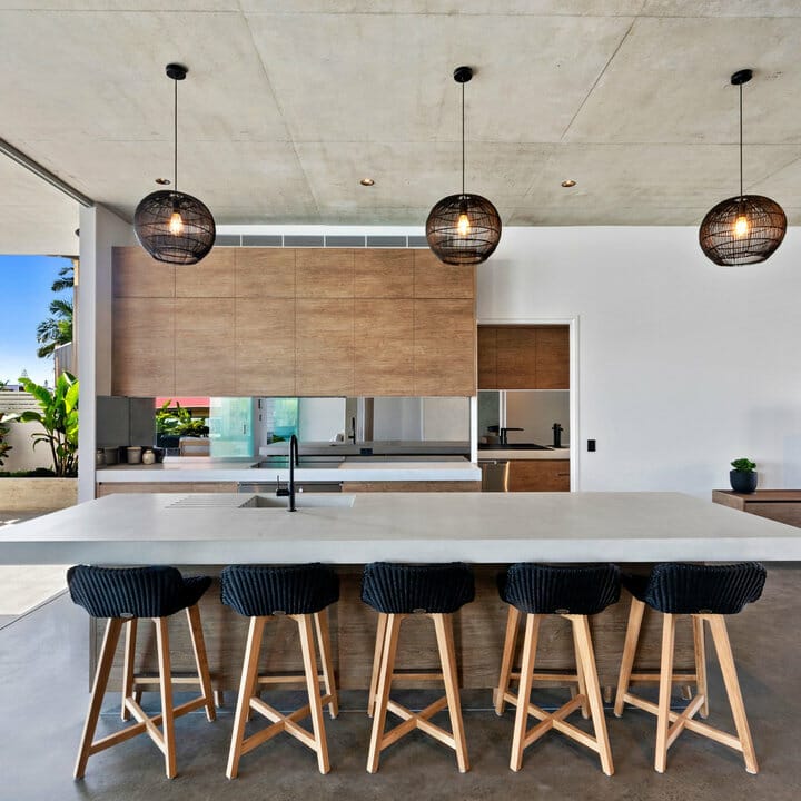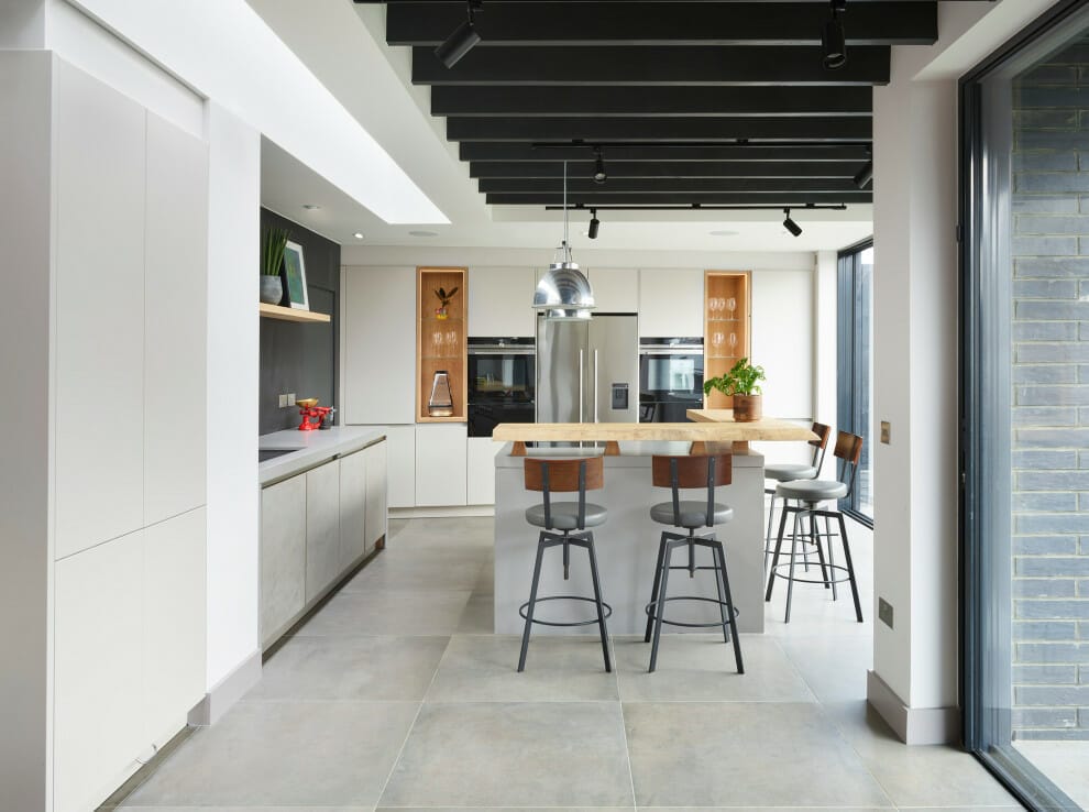 If you’re into all things urban, replicate this look. Silver appliances, handleless cabinets, and concrete tiles portray minimalism. Meanwhile, plants and bare wood elements ensure the scene doesn’t get lackluster.