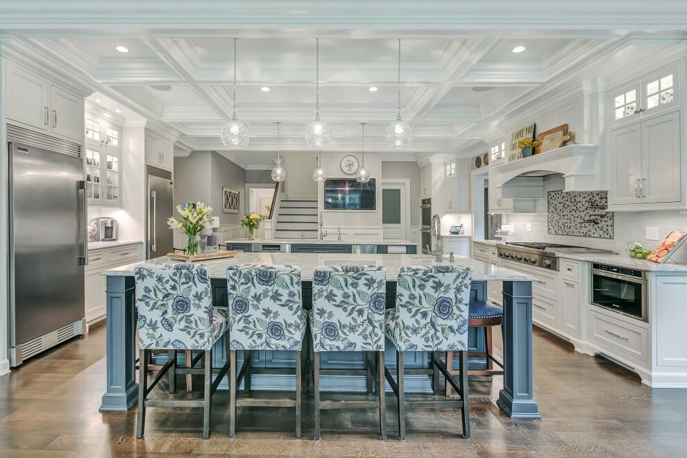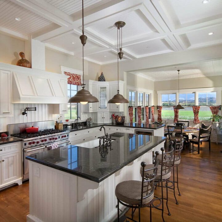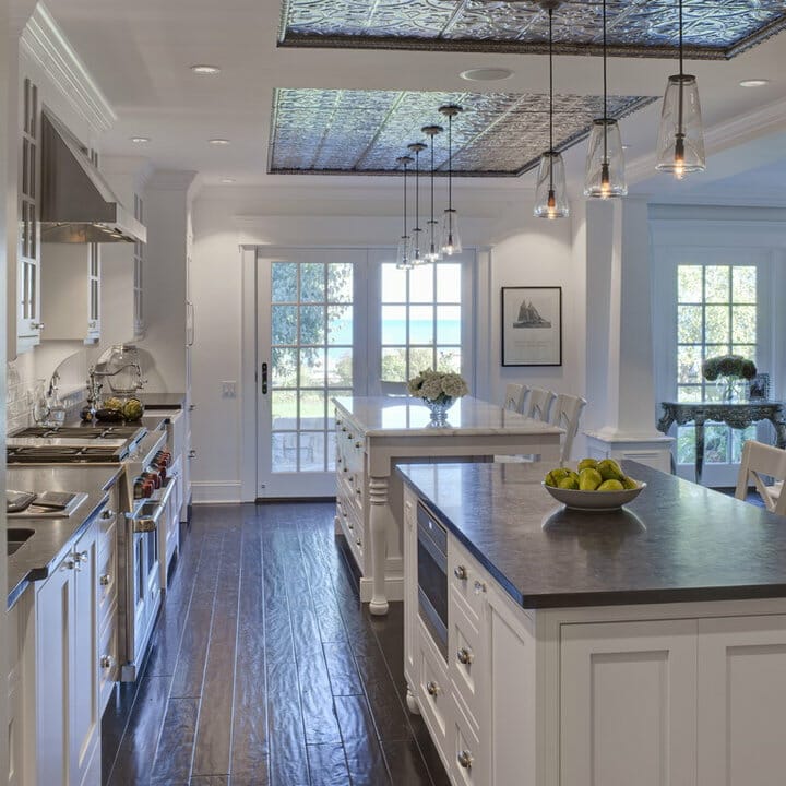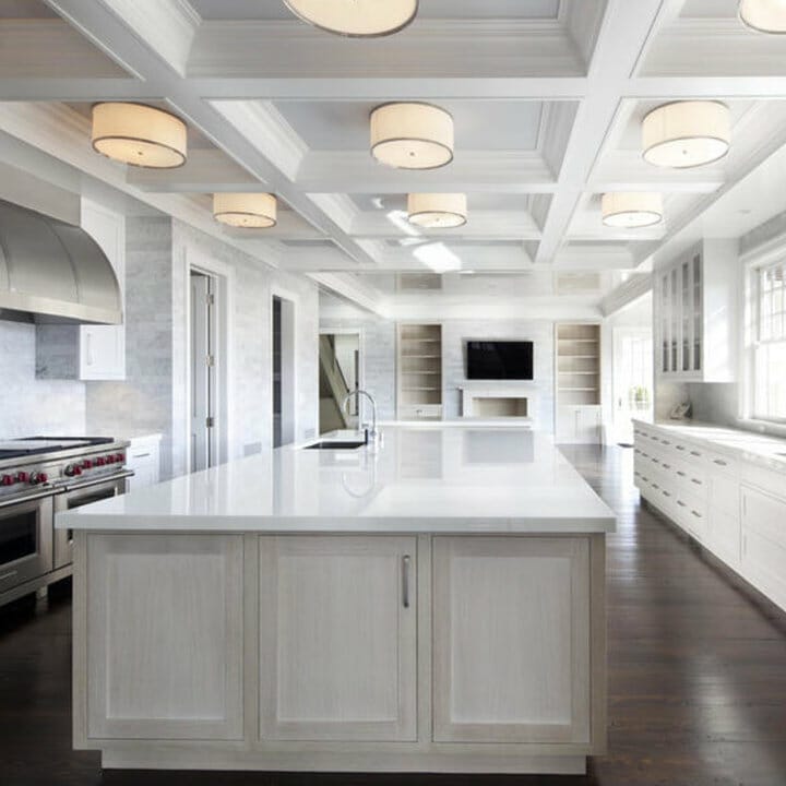 Need classic ceiling ideas for kitchens? If yes, the scene is worth replicating. The stark white rectangular coffered ceiling becomes the prime focus of the room.