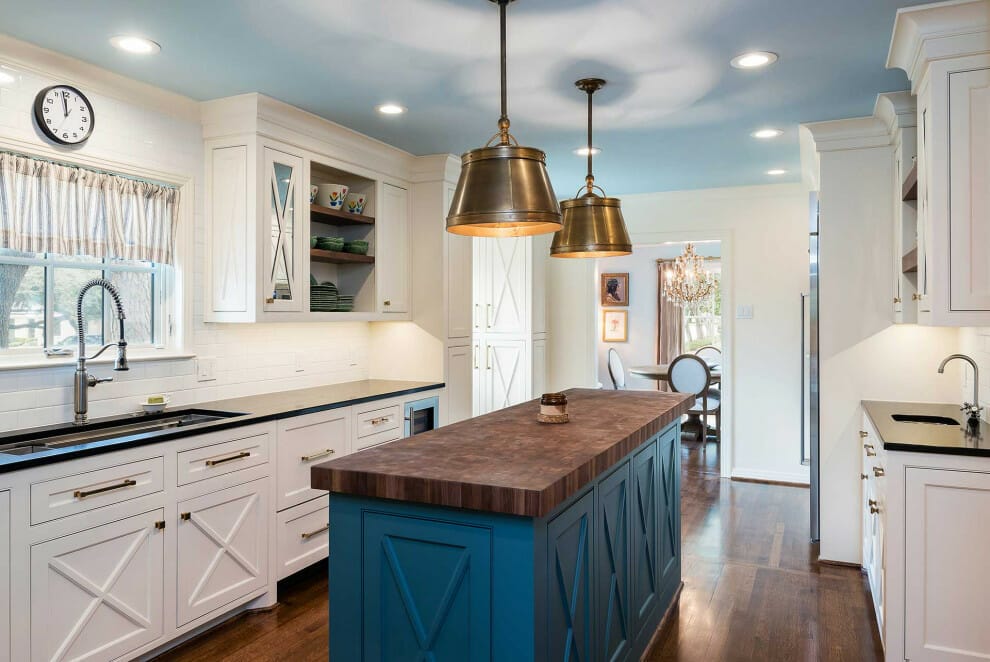 The navy island and metal pendants accentuate the ceiling. Because of the rich wood flooring and butcher block counter, the space stays homey.