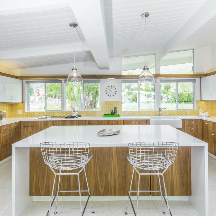 Here, the striking wooden island and lower cabinets get rid of the cold feeling. Moreover, bursts of punchy colors enliven the airy kitchen.