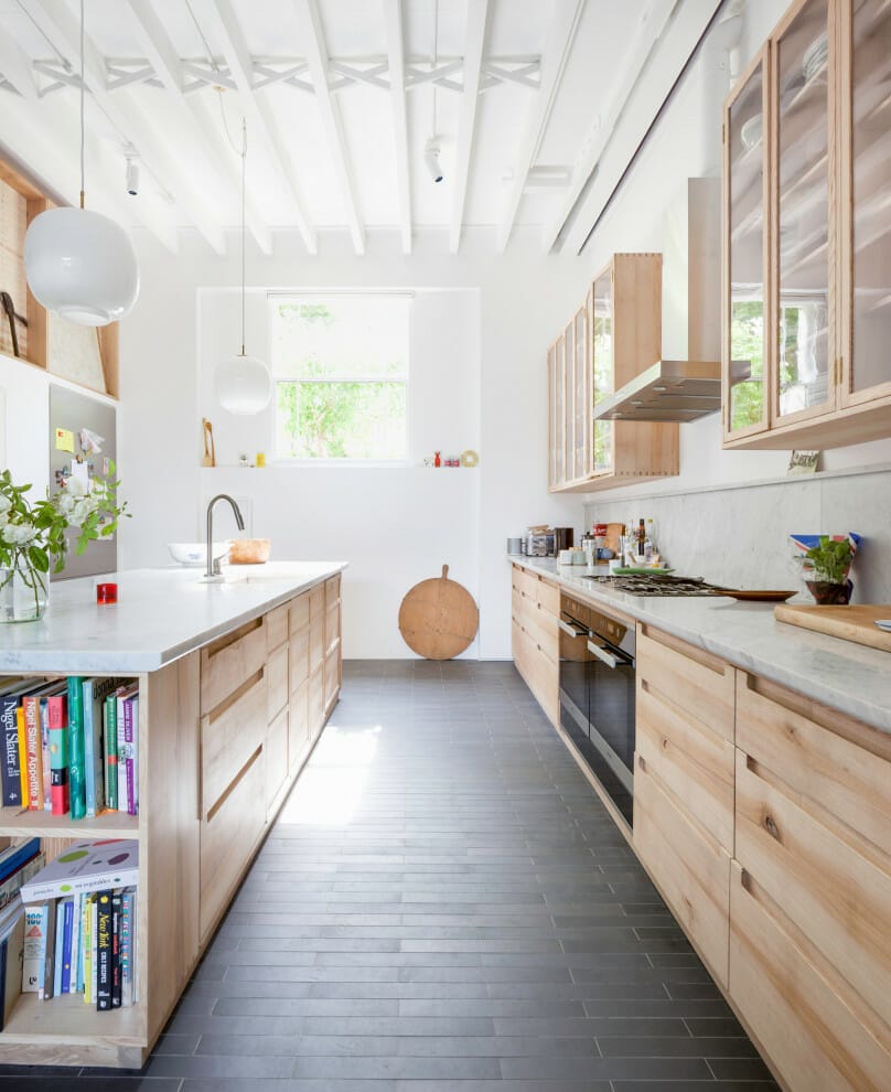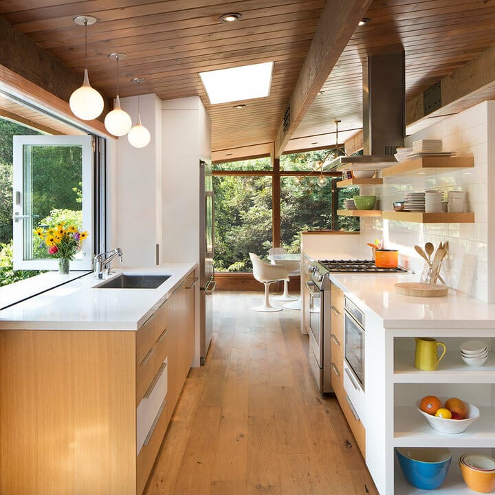 This galley kitchen is nothing short of inviting. The wooden planks adorn the ceiling while instilling warmth. Also, timber beams highlight the horizontal layout of the space.