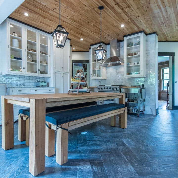 The blonde wood ceiling emphasizes the rustic island and two-tone dining chairs. It’s an inviting contrast to the clean white window frame and kitchen walls, too.