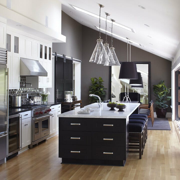 Three monochromatic pendants soften the ceiling’s clean lines. They accent the black marble counter while instilling cohesion, too.
