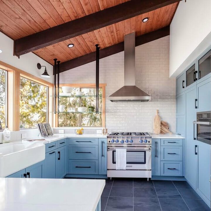 Need simple kitchen ceiling design ideas? If so, you should recreate this modern farmhouse kitchen in your home. The light blue-painted ceiling feels airy while enveloping the area.