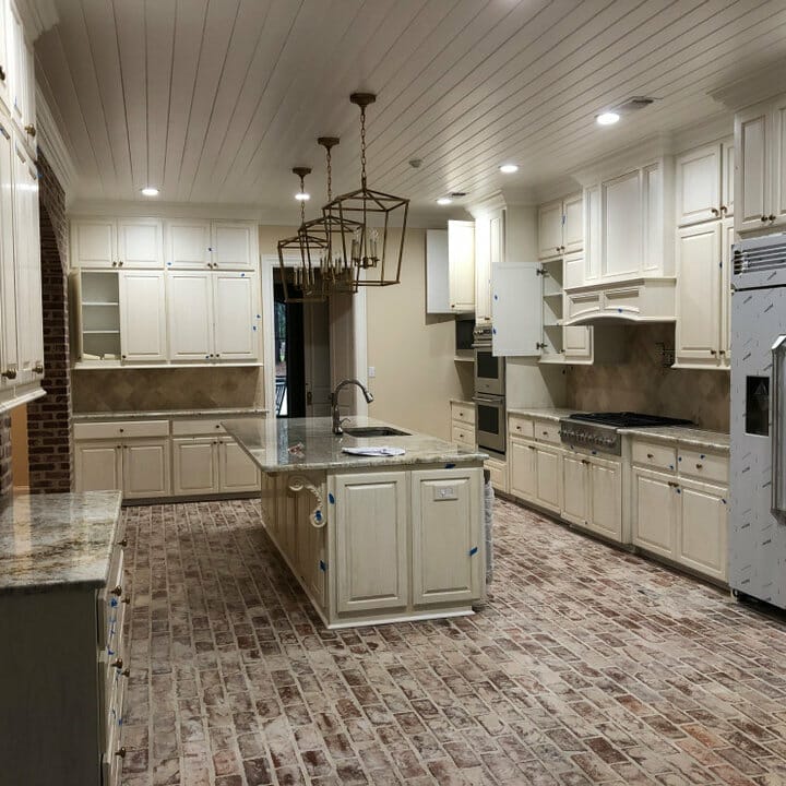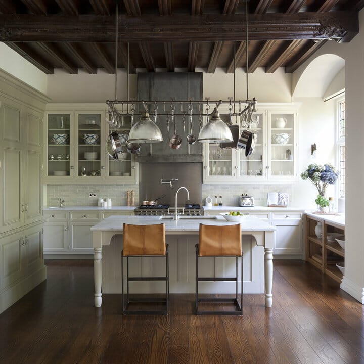 Due to the ceiling, vintage chandeliers can pose as the kitchen’s highlights. Meanwhile, diagonal tiles and whitewashed bricks infuse extra textures. They ensure the interior looks attractive, too.