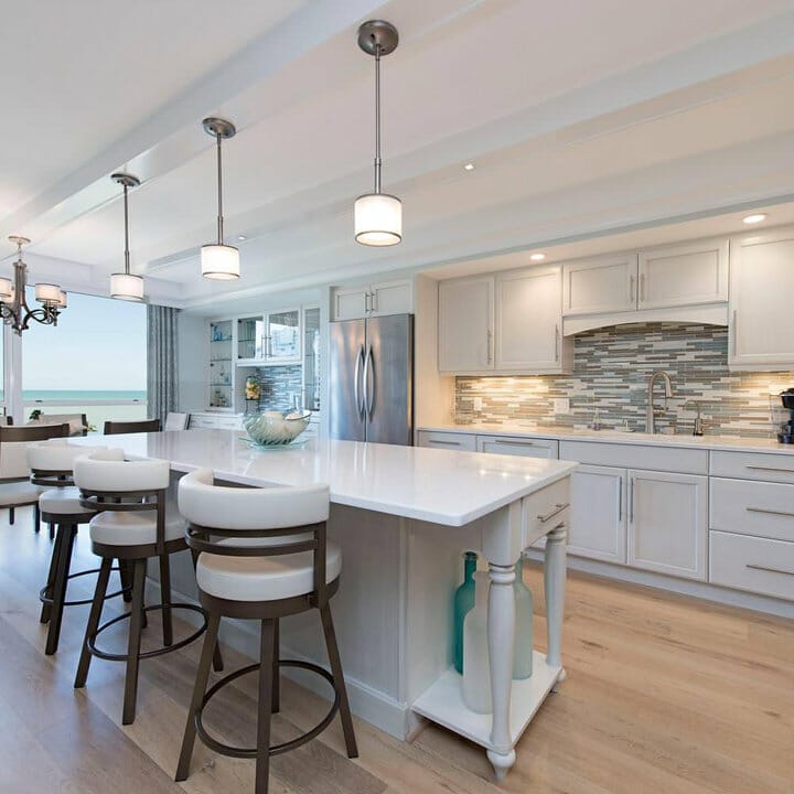 The soft white beadboard ceiling instills tranquility. Moreover, it harmonizes seamlessly with Shaker kitchen cabinets while emanating openness.