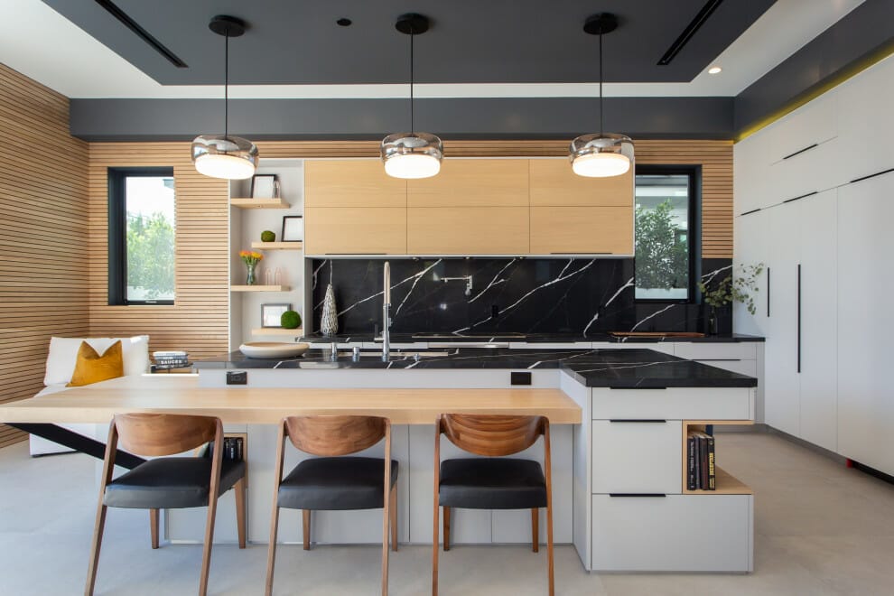 Here, the angular blonde wood canopy separates the kitchen from the eating area. Moreover, the black island and cabinetry imbue a generous dose of sophistication.