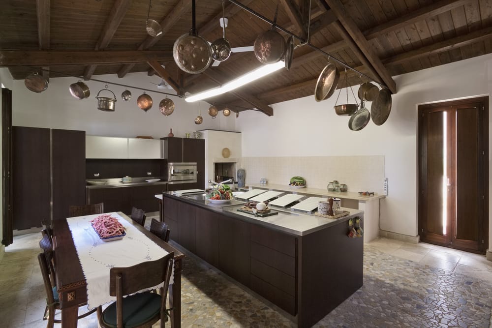 As you can see, the earth tones warm up this culinary space. It is filled with roughly hewn cabinetry and table.