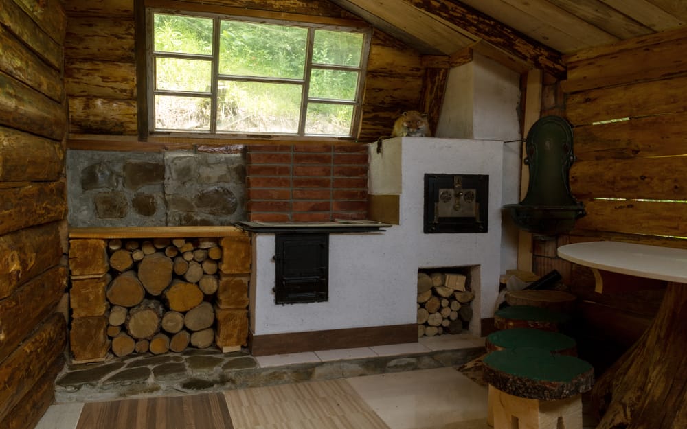 Log cabin walls and exposed kitchen ceiling beams provide layers of warmth. Flagstones and bricks are also featured to get a rustic aesthetic.