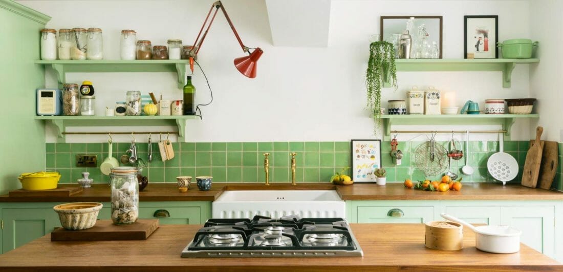 The emerald green tiles make for a show-stopping backsplash. Meanwhile, plain wood open shelving and varied house plants bring nature indoors.