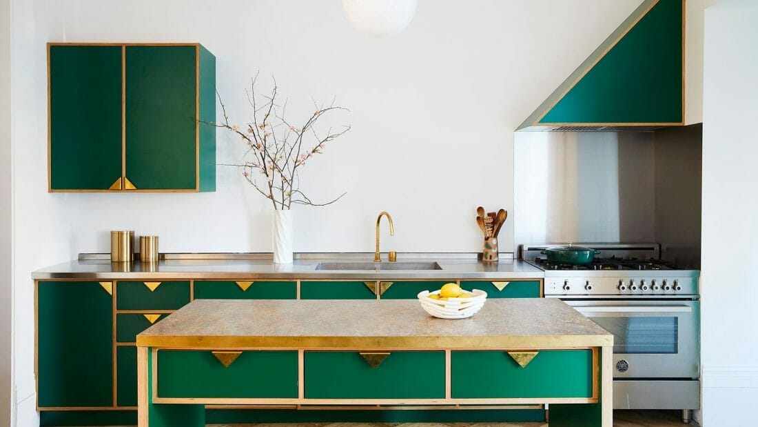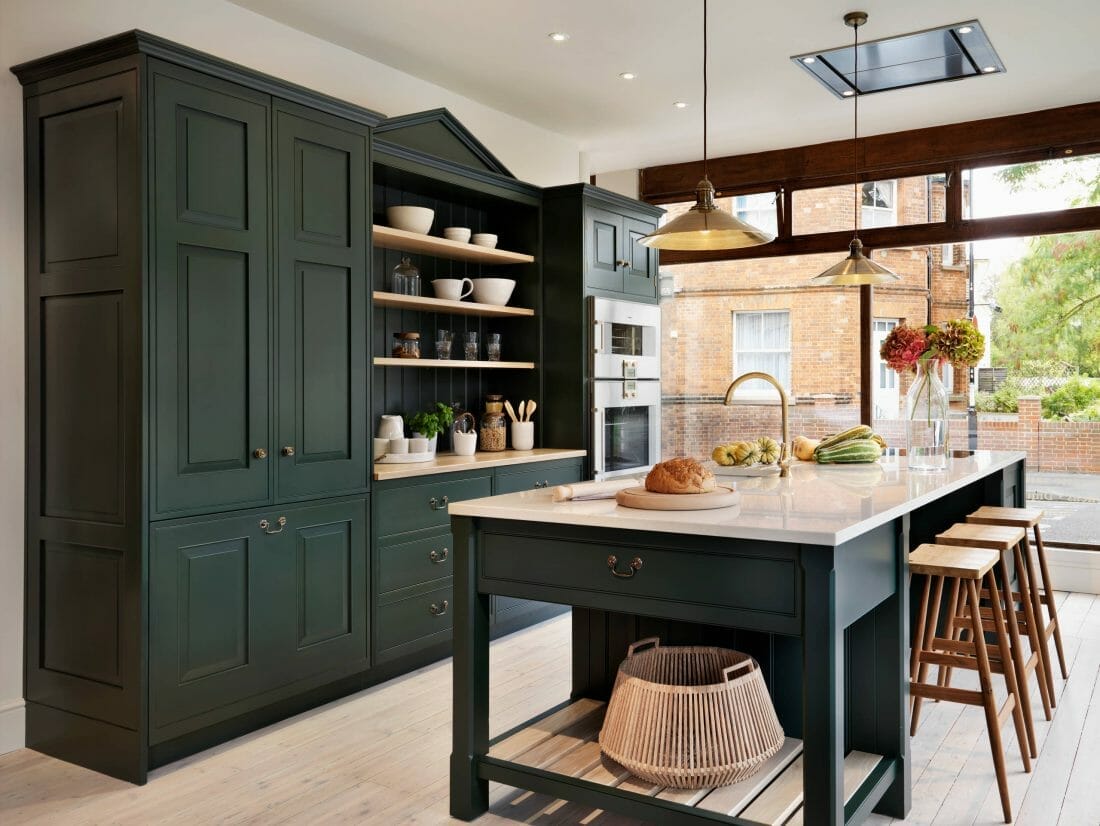 Pine green is possibly the best green for kitchen cabinets. Here, it revives the streamlined island and cabinetry.