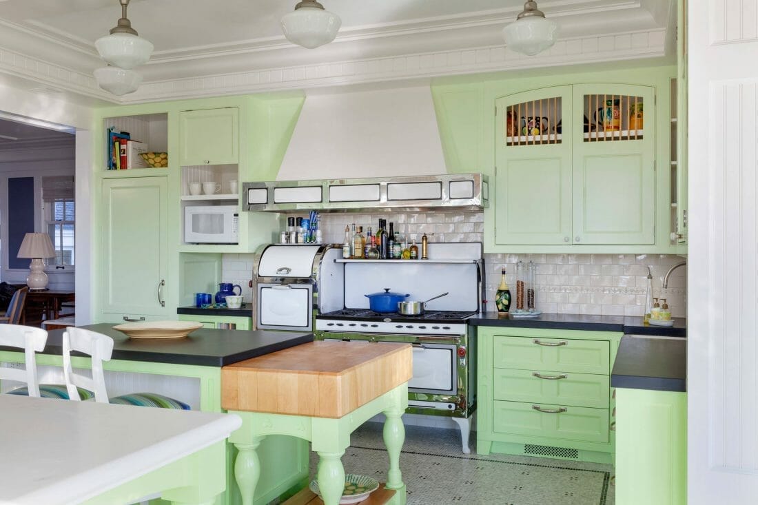 Some homeowners are after tranquil kitchens. If you’re like them, coat your cabinets with two different pastel green paint colors. They add subtle dynamism while still lending this vintage culinary space a cohesive look.