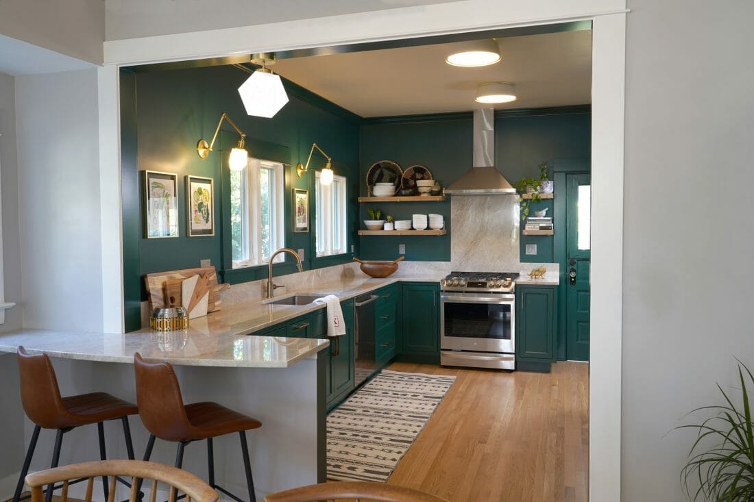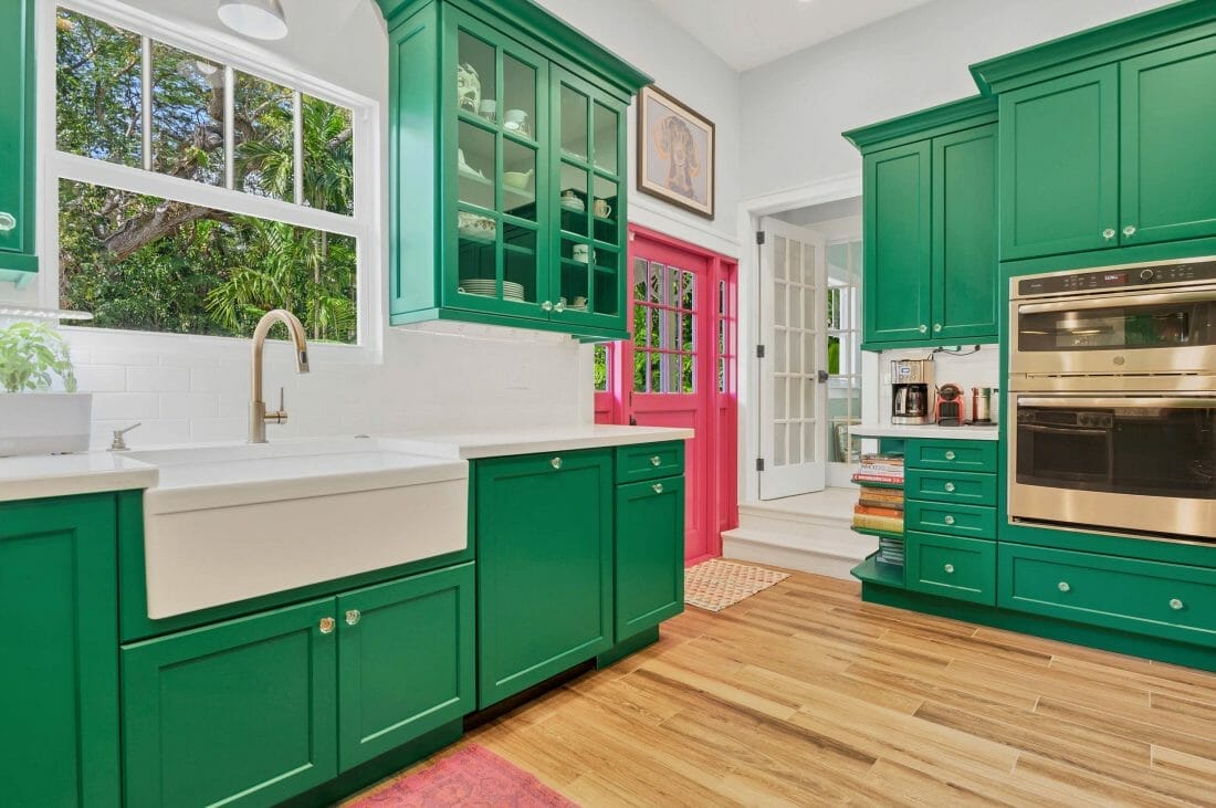 Here, the Kelly green bench and cabinets pose as focal points. Furthermore, they revitalize the otherwise uninviting kitchen.