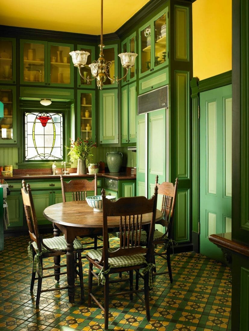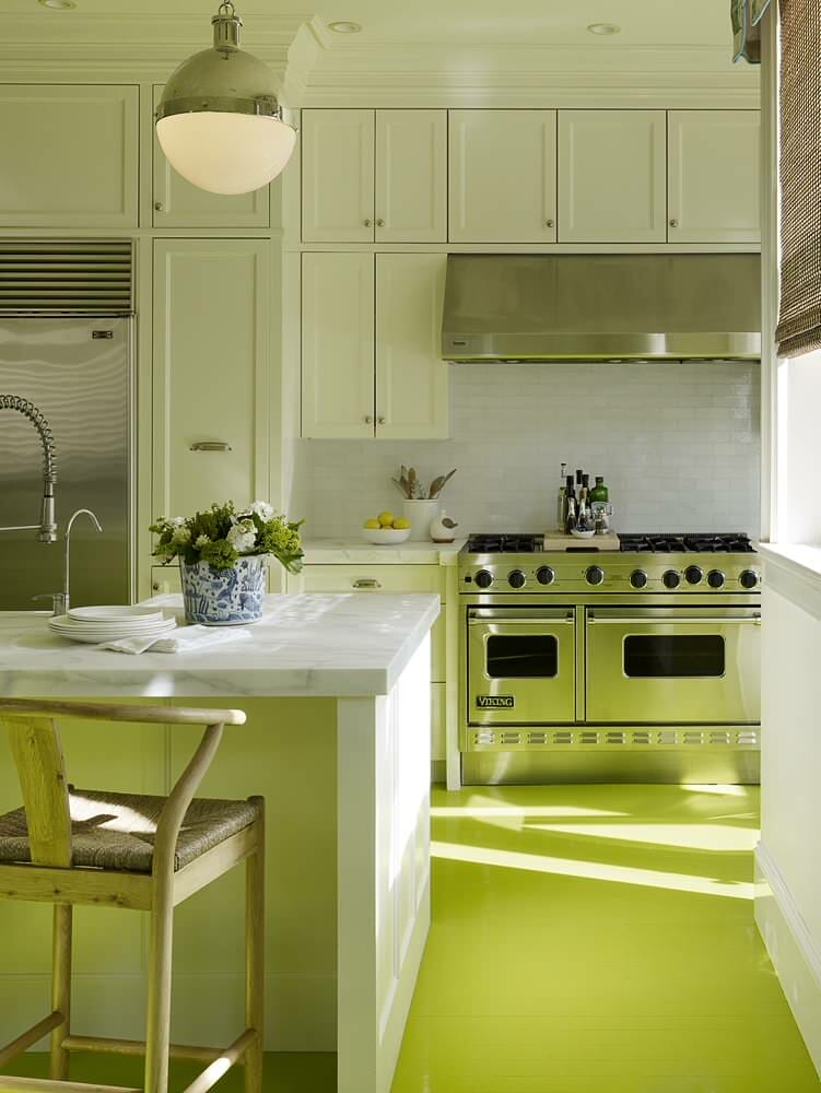 In this room, the pale green-painted cabinetry delivers an exquisite contrast to the lime green flooring. Moreover, metallic appliances symbolize industrial modernism. Meanwhile, the china flower vase and woven dining chairs provide so much personality.