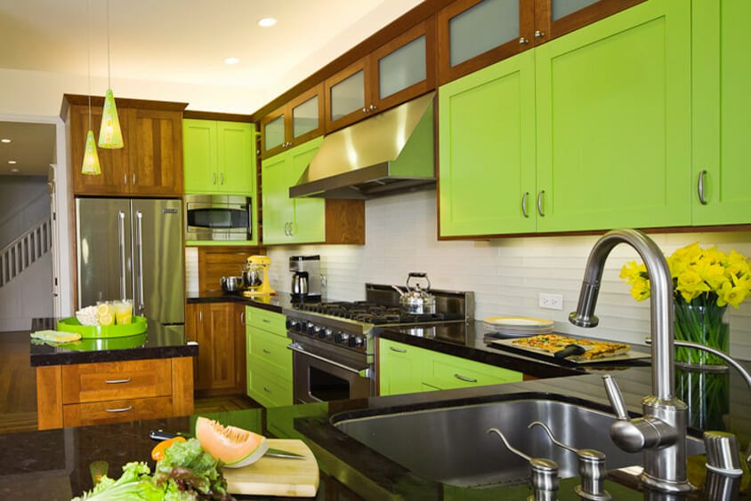 Meanwhile, the maple-stained wood cabinetry and white backsplash offset lime green cabinets. Yellow accents are evocative of summer days. Furthermore, black granite countertops carry a decent dose of drama.