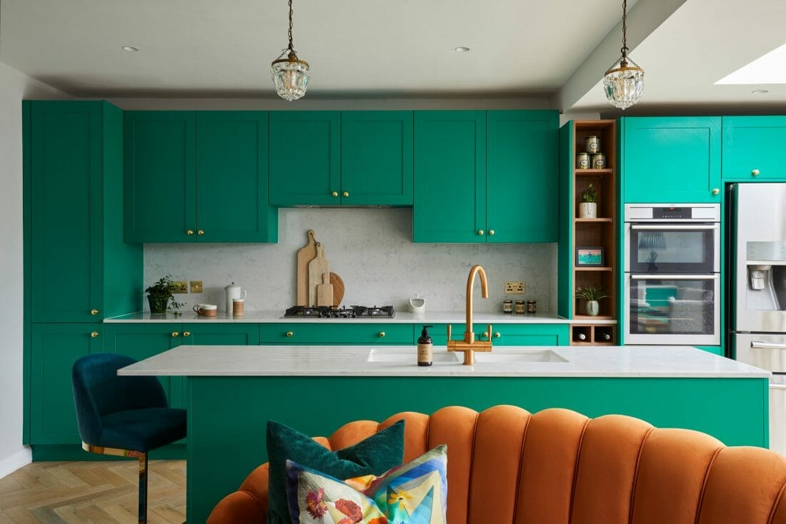 Daring green hues aren’t for faint-hearted homeowners. If you’re fearless, integrate turquoise green units into your kitchen. They make this culinary space feel like a jewel box.