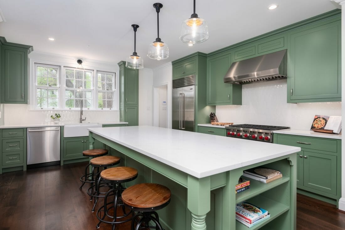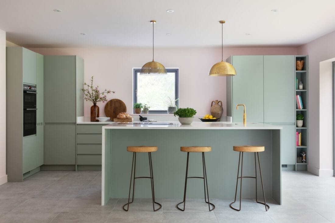 Green kitchen paint color ideas aren’t complete without soft pastels. Here, the pastel green cutout cabinetry and island add some life while mingling with bamboo pendants.